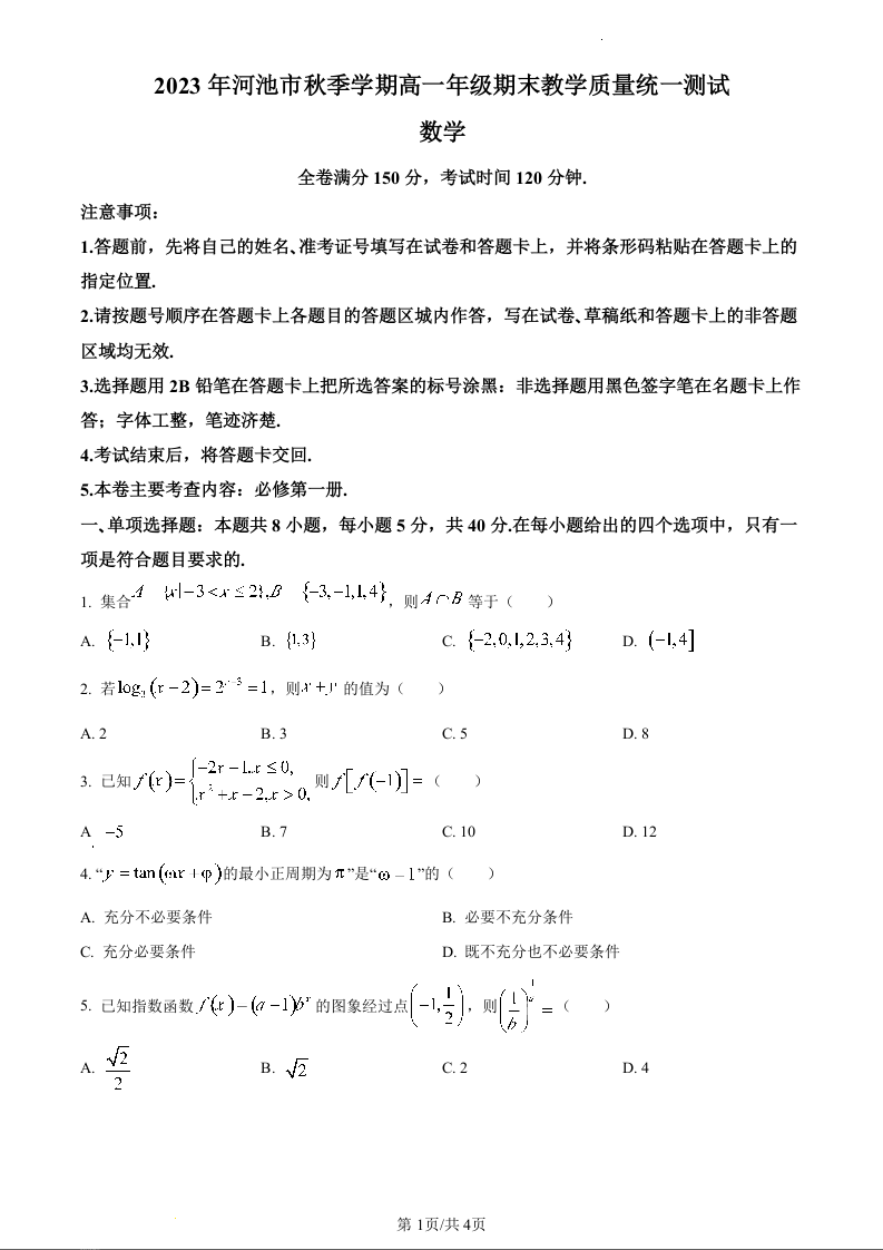 广西壮族自治区河池市2023-2024学年高一上学期期末考试数学(原卷版)