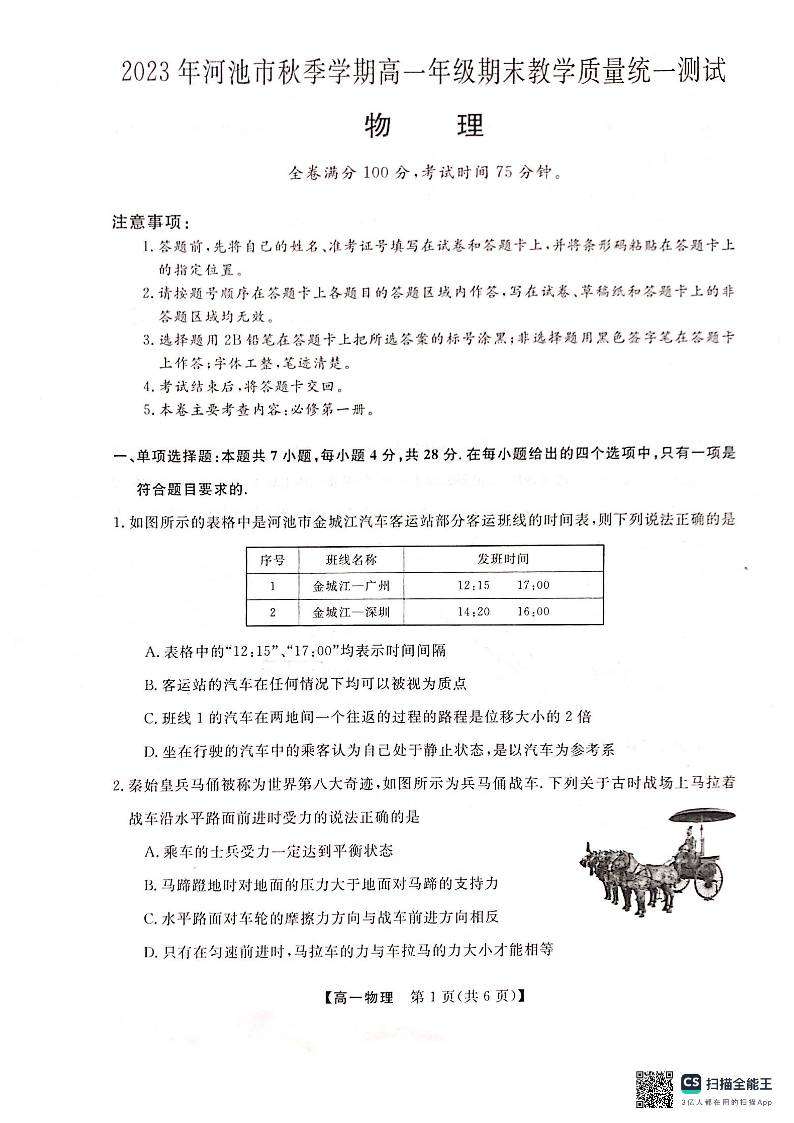广西壮族自治区河池市2023-2024学年高一上学期期末考试物理