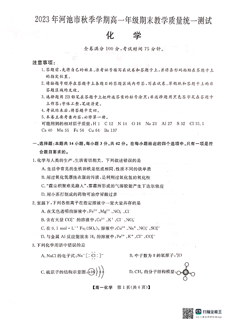广西壮族自治区河池市2023-2024学年高一上学期期末考试化学