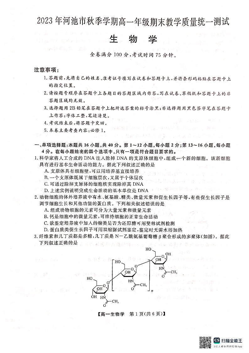 广西壮族自治区河池市2023-2024学年高一上学期期末考试生物