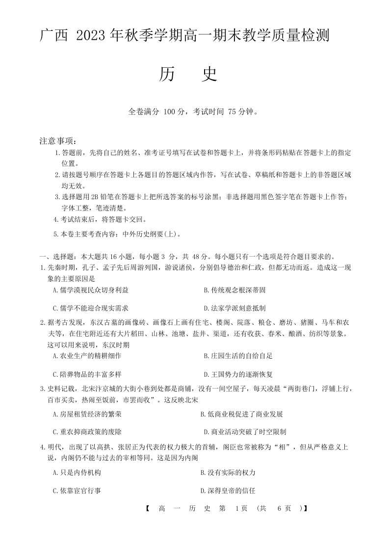 广西壮族自治区河池市2023-2024学年高一上学期期末考试历史