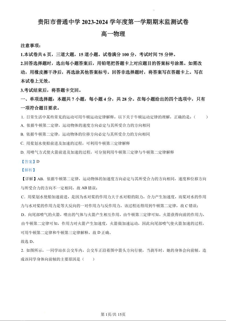 贵州省贵阳市普通中学2023-2024学年高一上学期期末监测考试物理(精品解析版)