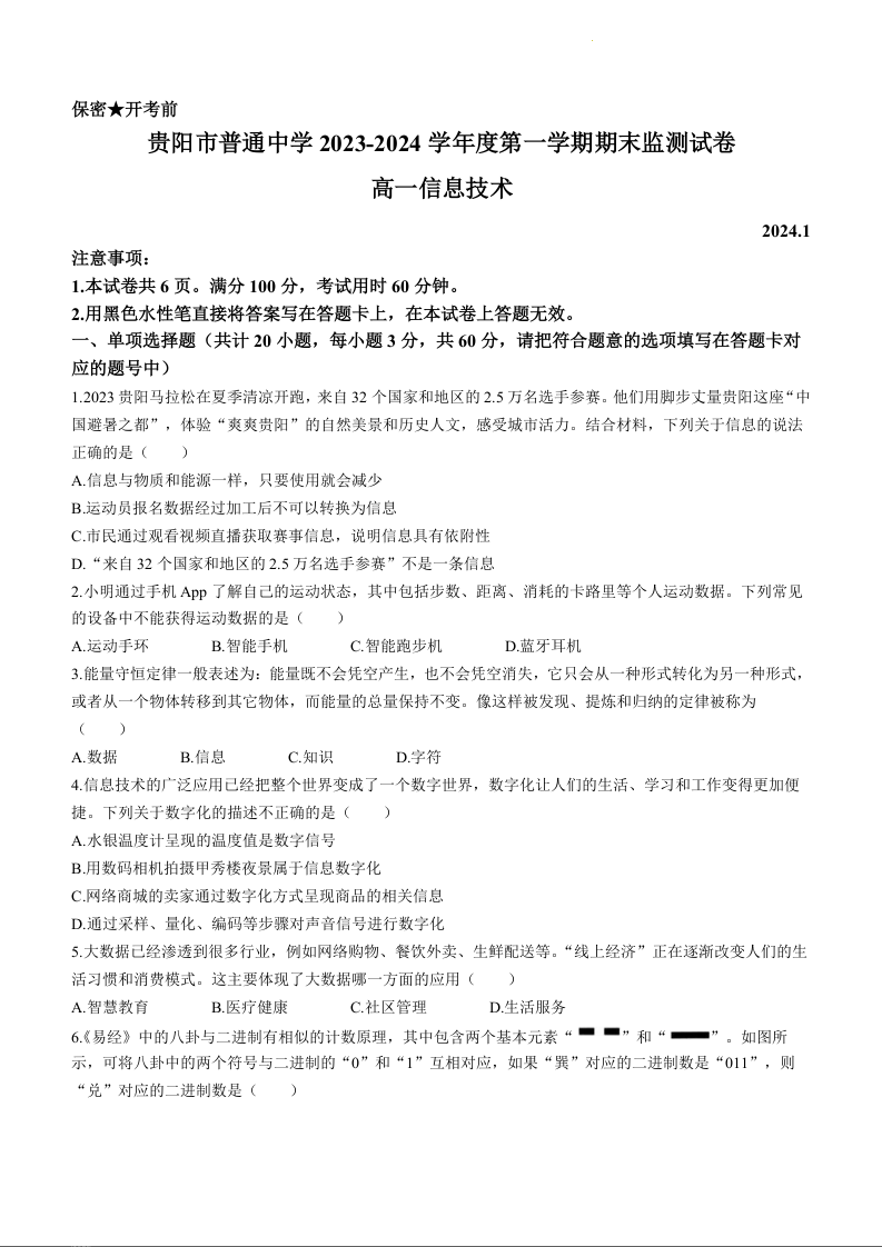 贵州省贵阳市普通中学2023-2024学年高一上学期期末监测考试信息技术