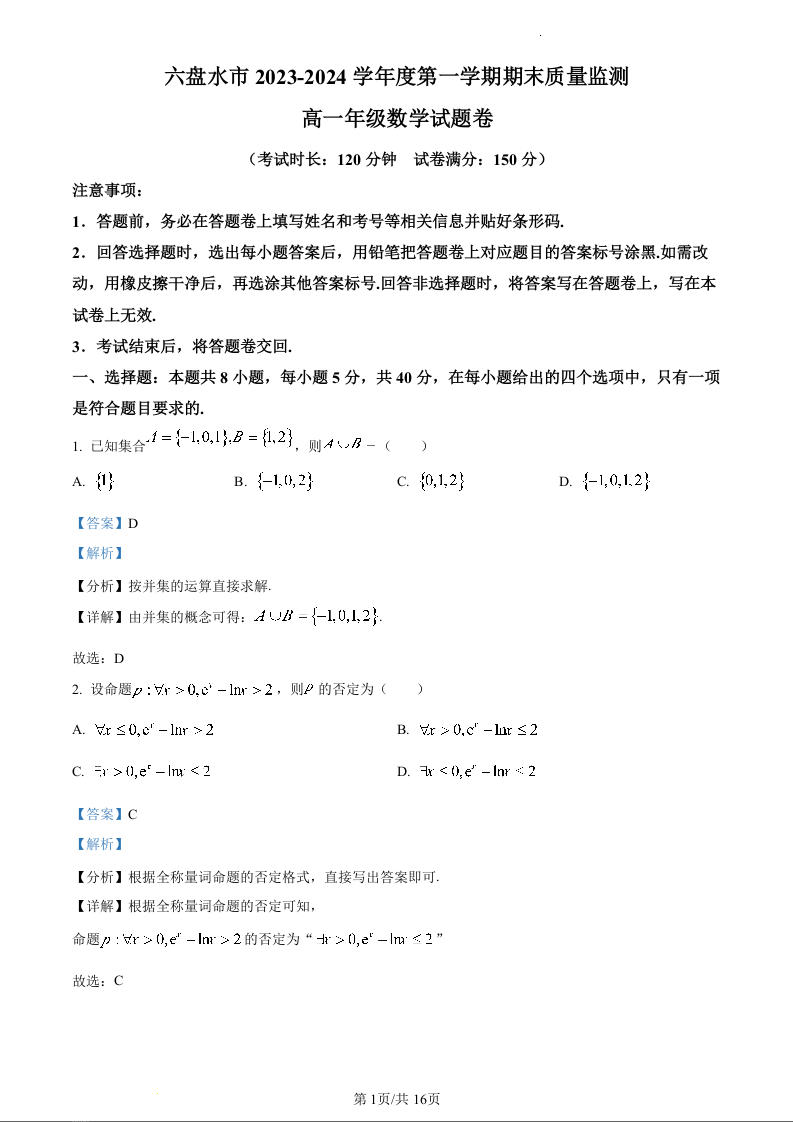 贵州省六盘水市2023-2024学年高一上学期期末考试数学(精品解析版)