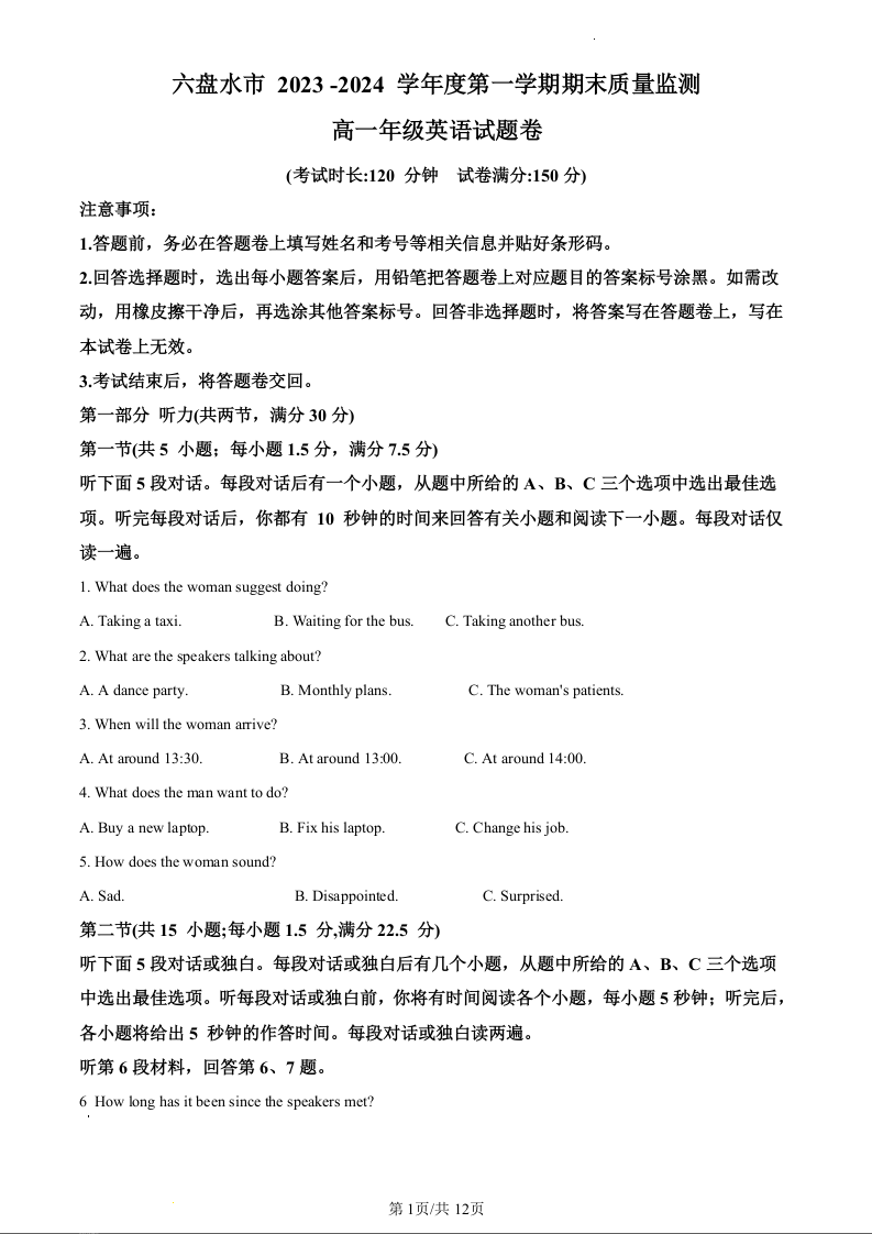 贵州省六盘水市2023-2024学年高一上学期期末考试英语(原卷版)
