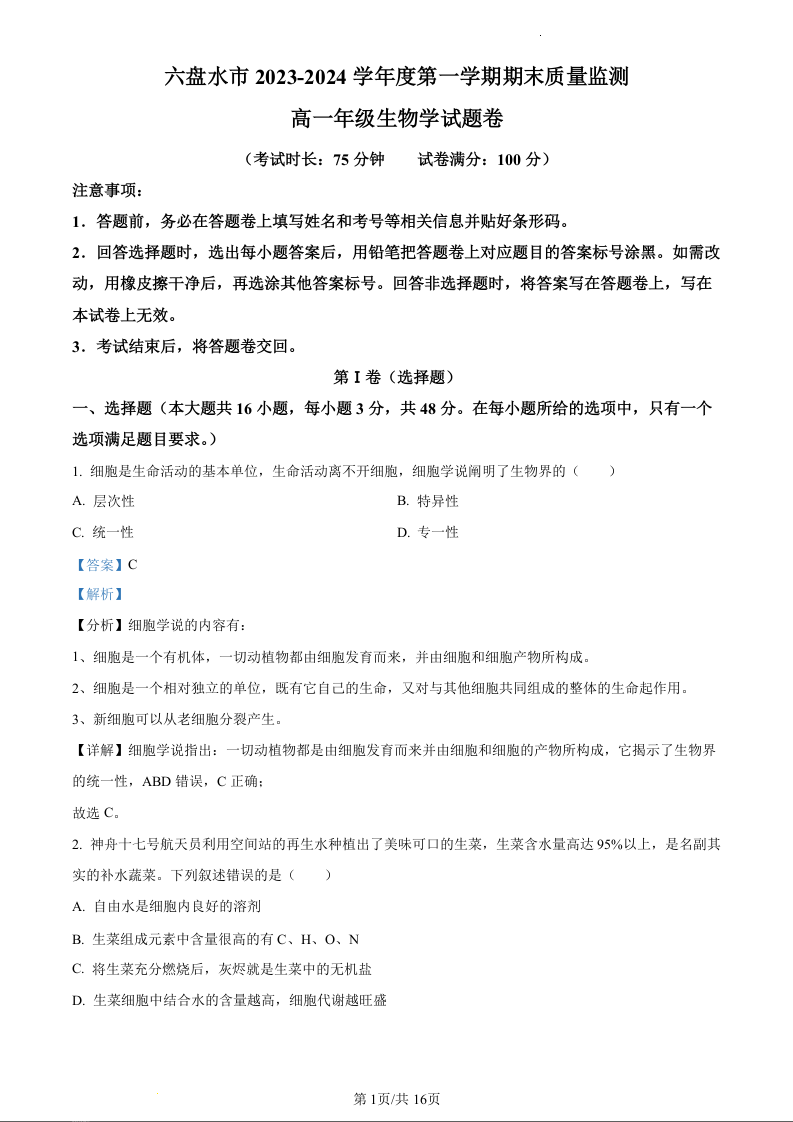 贵州省六盘水市2023-2024学年高一上学期期末考试生物(精品解析版)