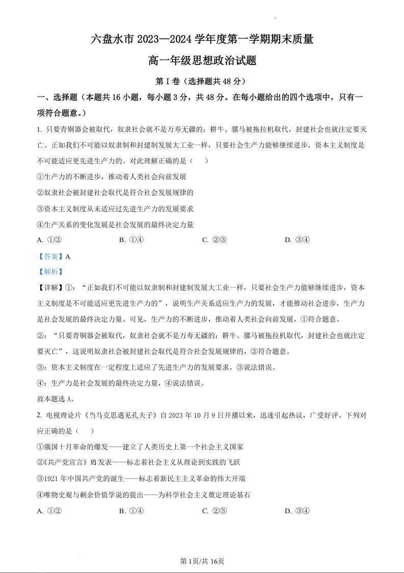 贵州省六盘水市2023-2024学年高一上学期期末考试政治(精品解析版)