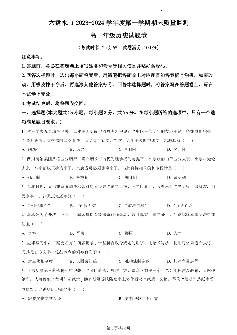 贵州省六盘水市2023-2024学年高一上学期期末考试历史(原卷版)