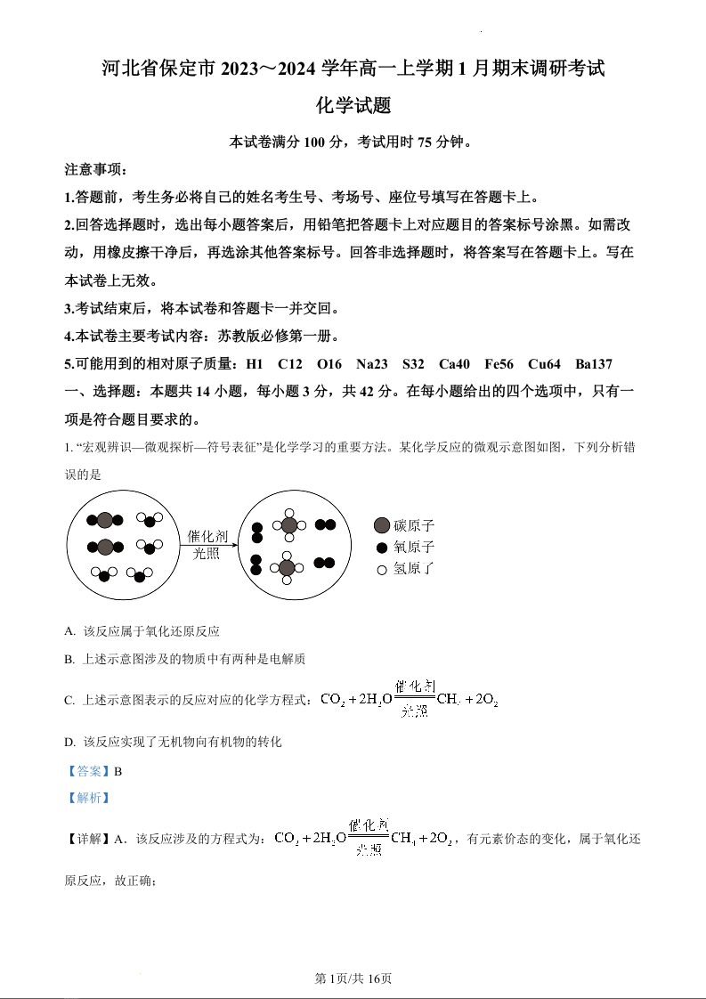 河北省保定市2023-2024学年高一上学期期末考试化学(精品解析版)