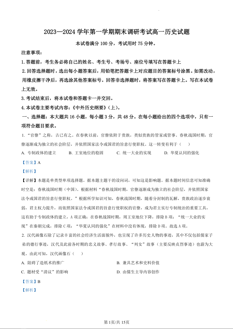 河北省保定市2023-2024学年高一上学期期末考试历史(精品解析版)