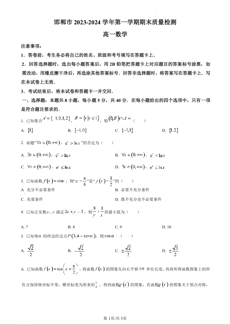 河北省邯郸市2023-2024学年高一上学期期末质量测试数学(原卷版)