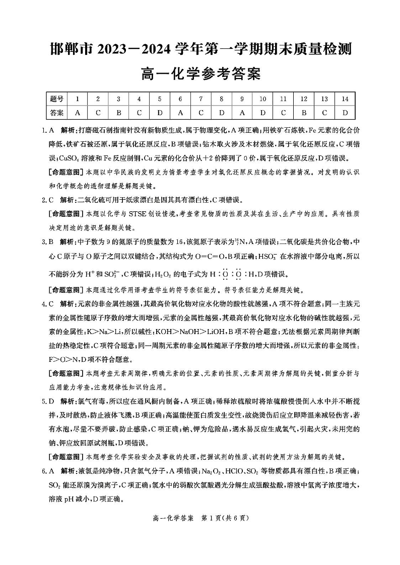 河北省邯郸市2023-2024学年高一上学期期末质量测试化学答案
