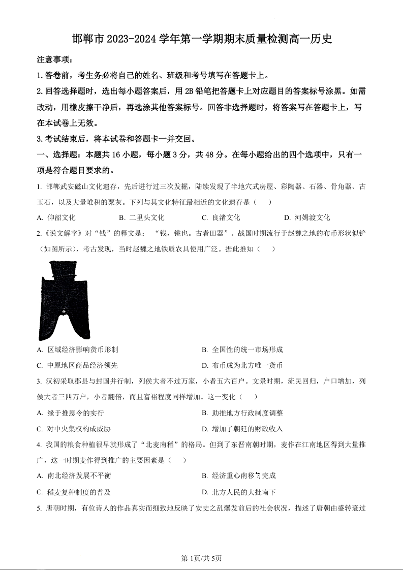 河北省邯郸市2023-2024学年高一上学期期末质量测试历史(原卷版)