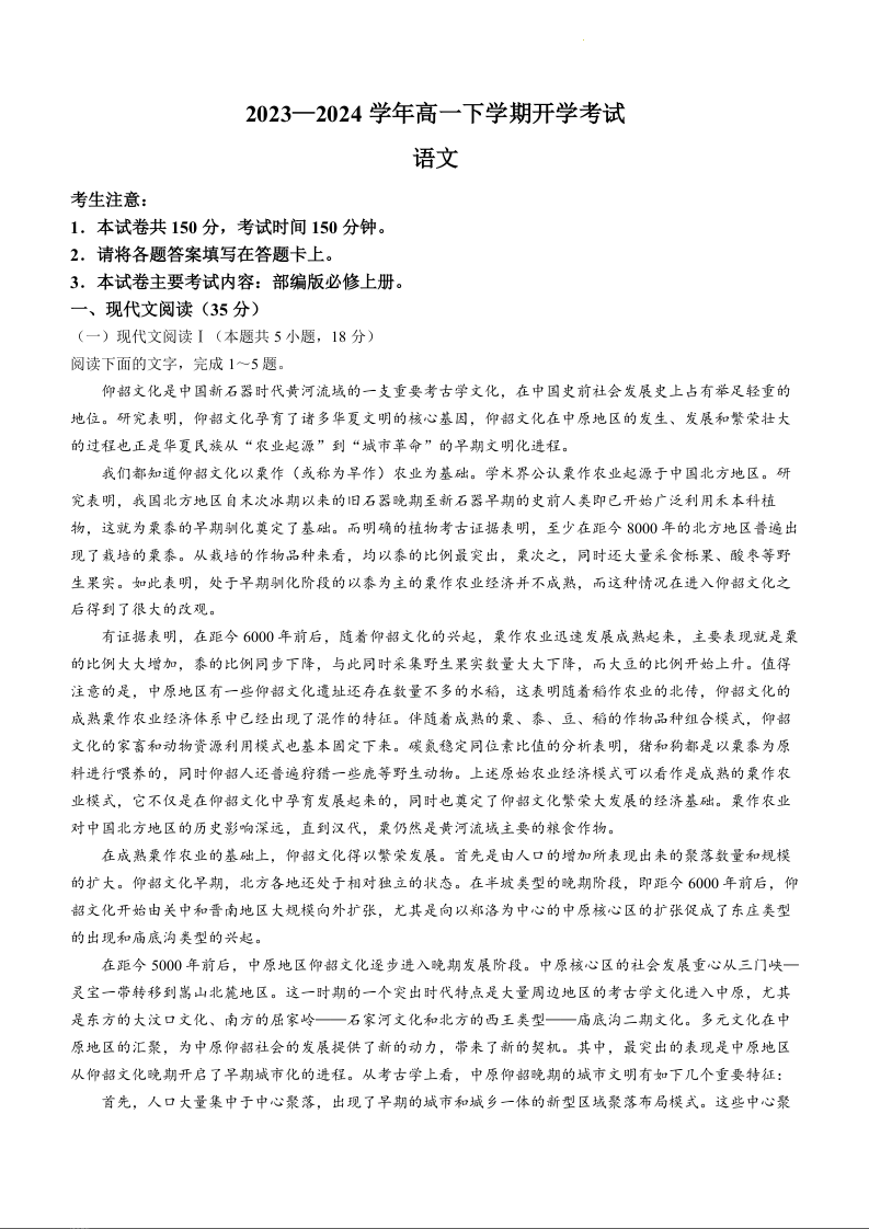 河南省许平汝名校2023-2024学年高一下学期开学考试语文+答案