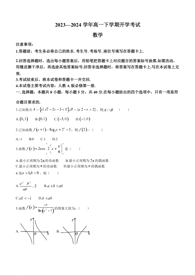 河南省许平汝名校2023-2024学年高一下学期开学考试数学+答案