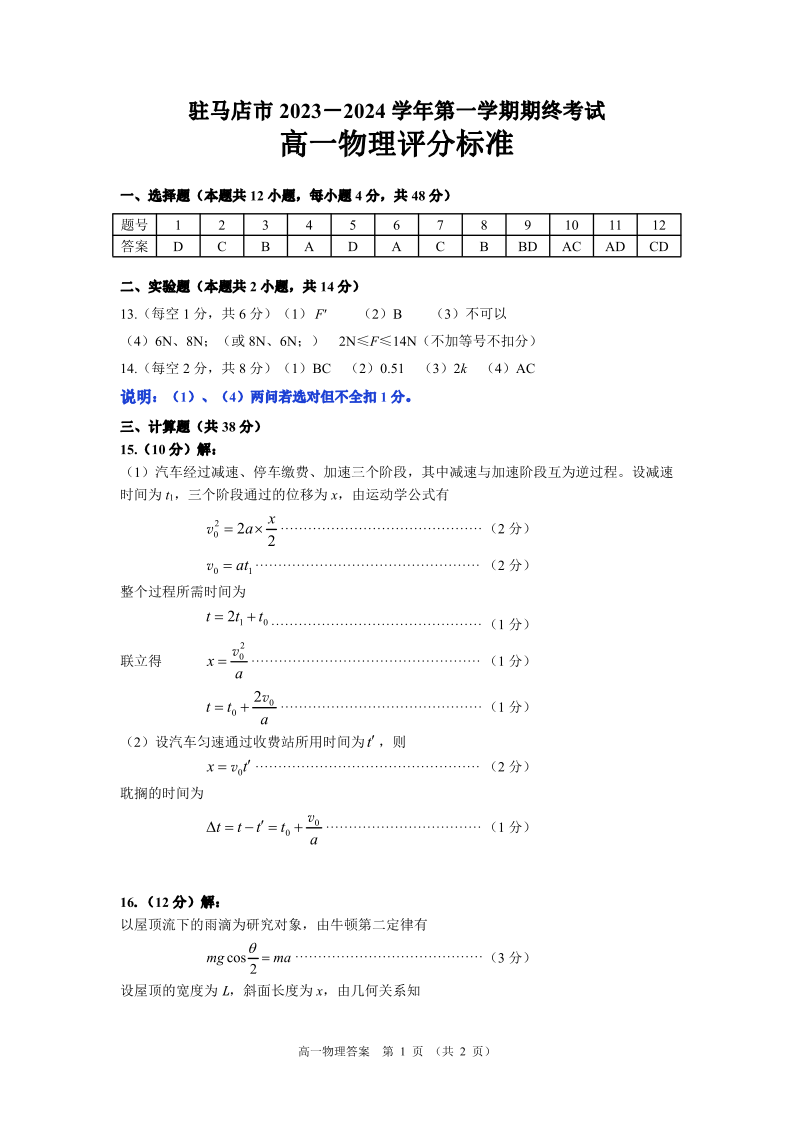 河南省驻马店市2023-2024学年高一上学期1月期末考试物理答案