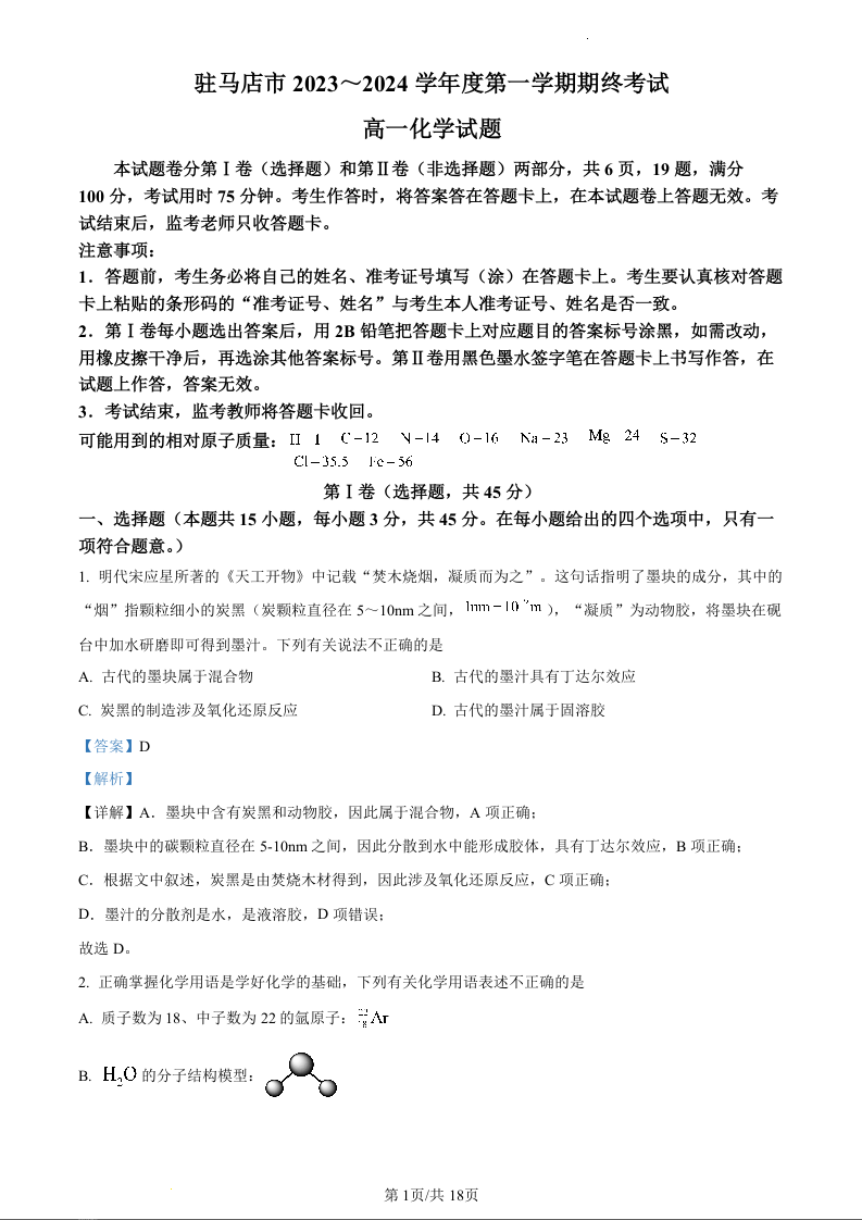 河南省驻马店市2023-2024学年高一上学期1月期末考试化学(精品解析版)
