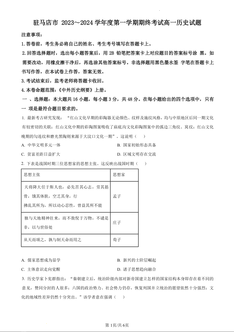 河南省驻马店市2023-2024学年高一上学期1月期末考试历史(原卷版)