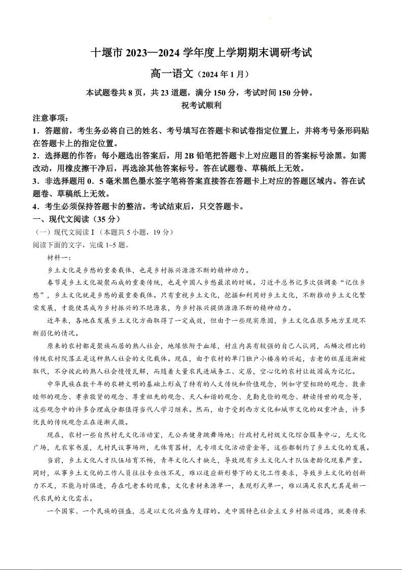 湖北省十堰市2023-2024学年高一上学期期末调研考试语文+答案