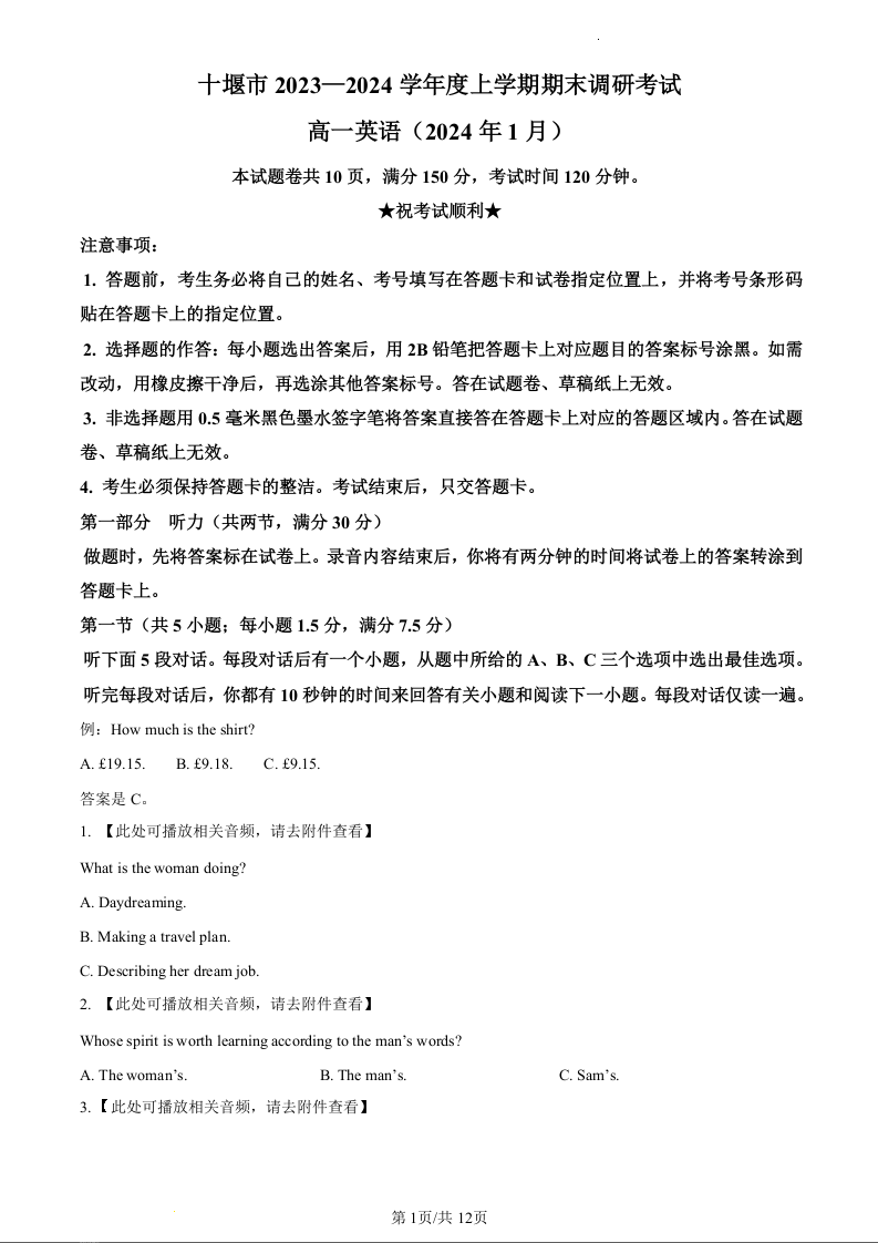 湖北省十堰市2023-2024学年高一上学期期末调研考试英语(原卷版)