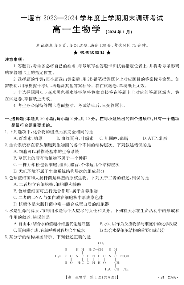 湖北省十堰市2023-2024学年高一上学期期末调研考试生物