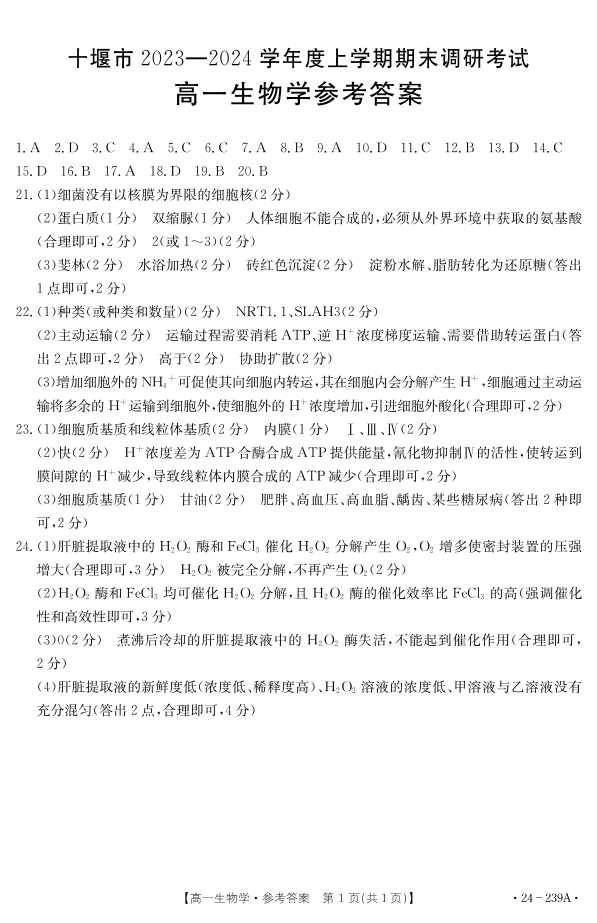湖北省十堰市2023-2024学年高一上学期期末调研考试生物答案