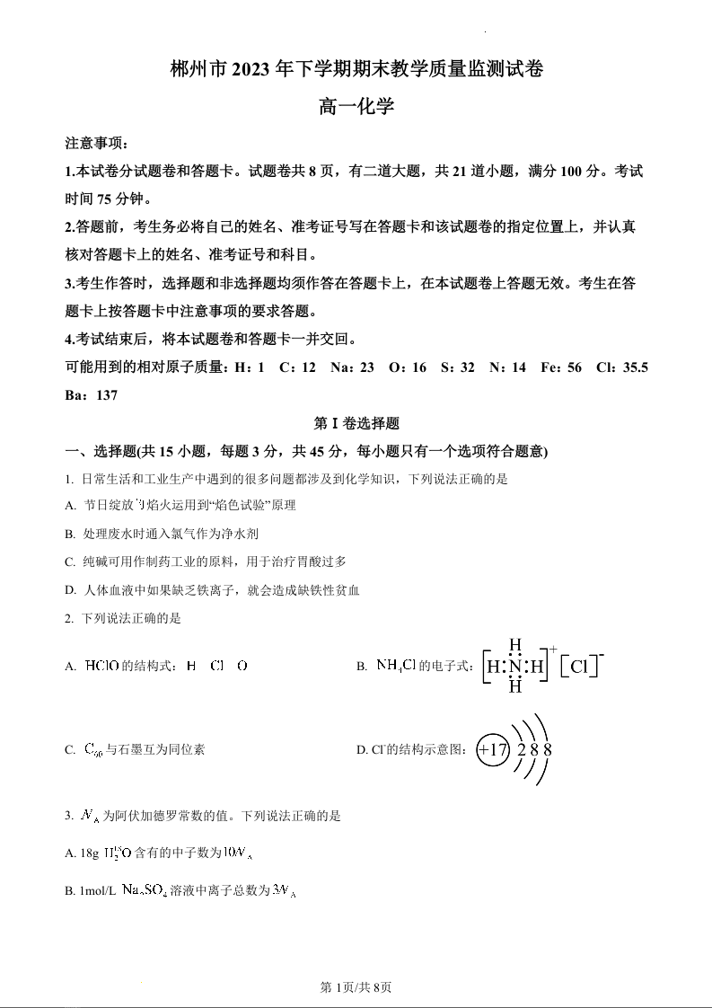 湖南省郴州市2023-2024学年高一上学期期末考试化学 (原卷版)