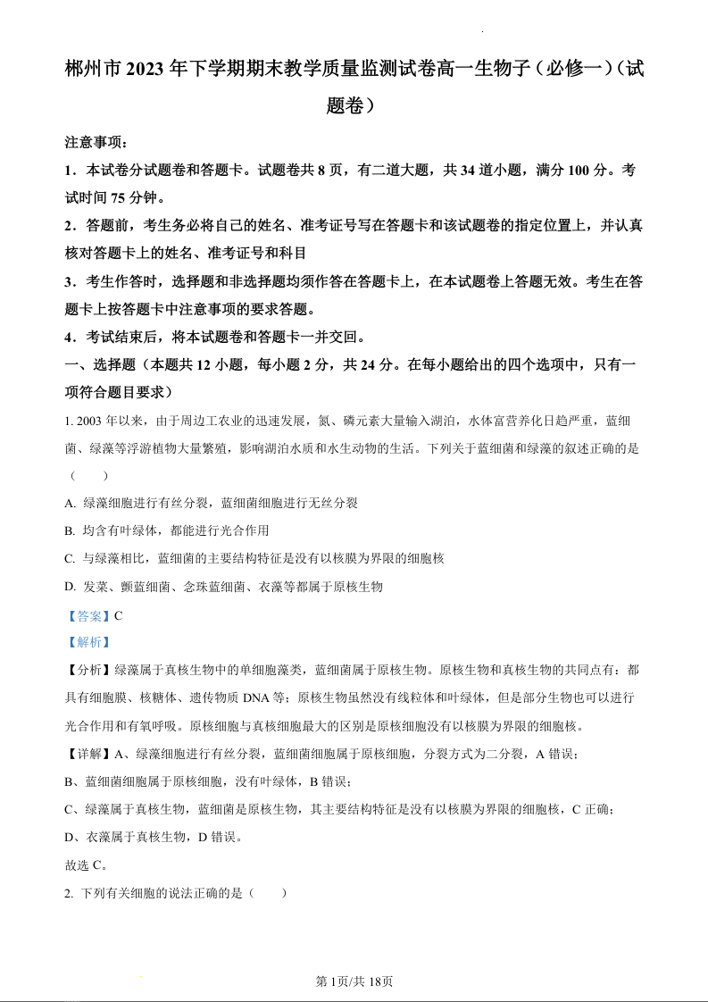 湖南省郴州市2023-2024学年高一上学期期末考试生物(精品解析版)
