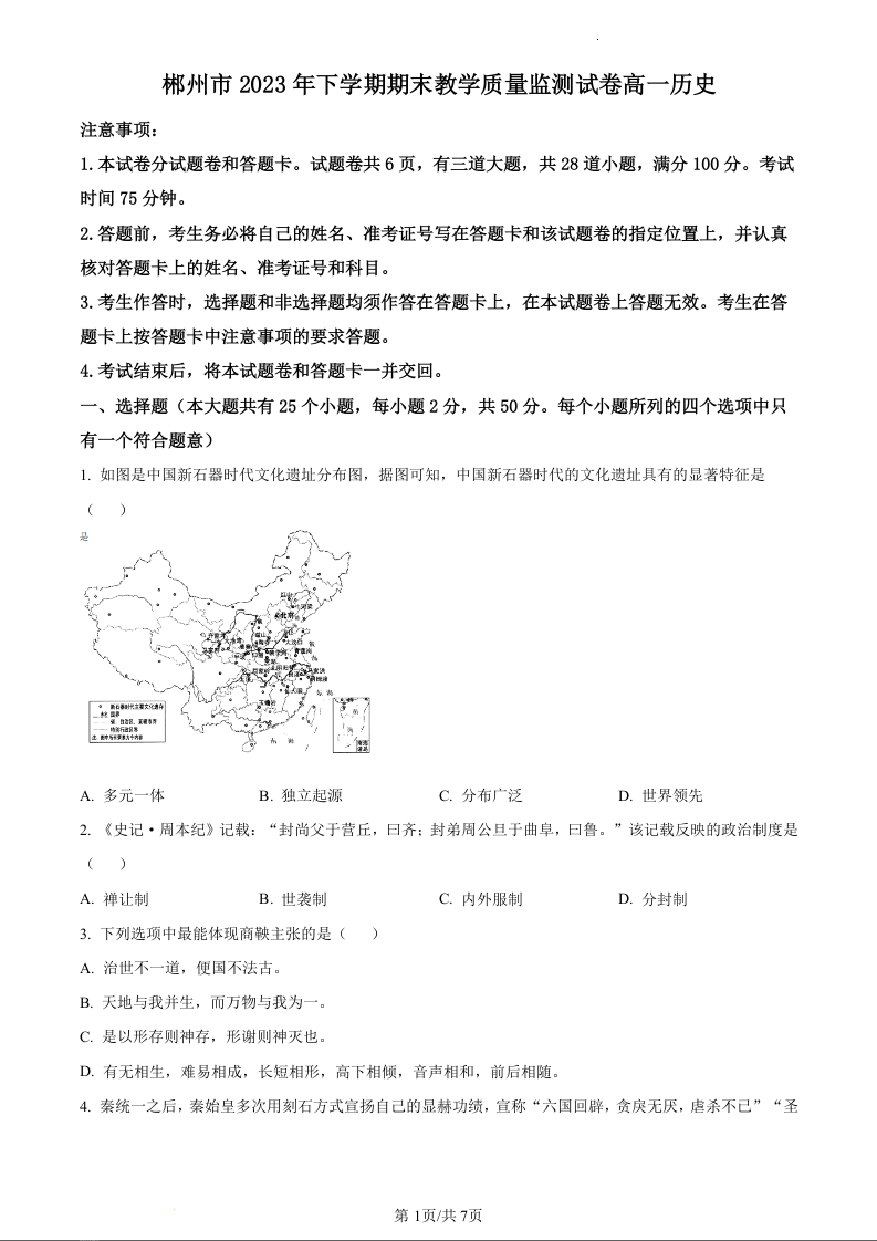 湖南省郴州市2023-2024学年高一上学期期末考试历史(原卷版)