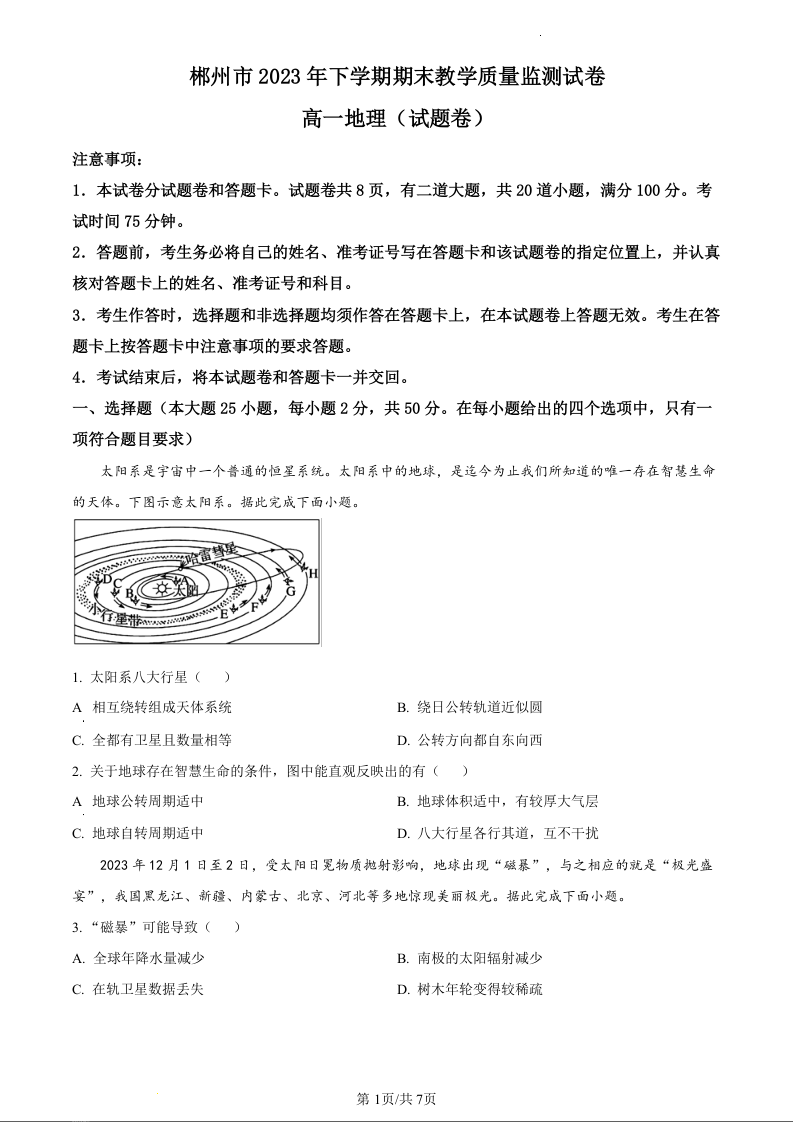 湖南省郴州市2023-2024学年高一上学期期末考试地理(原卷版)