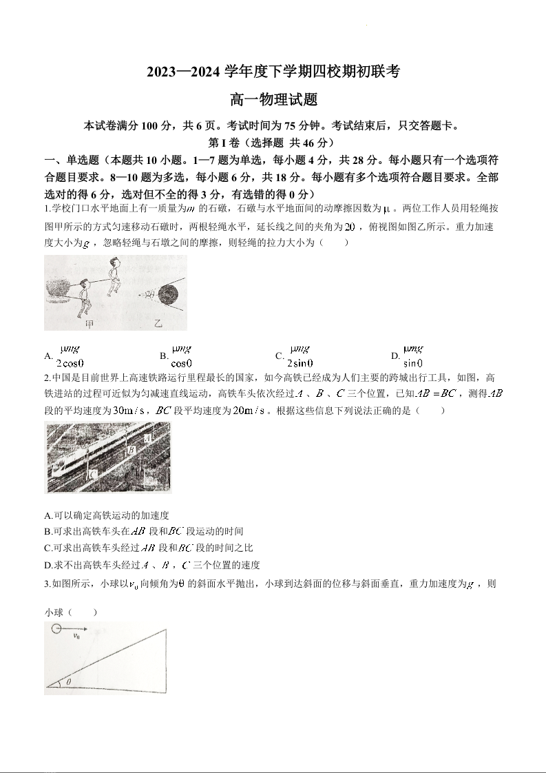 吉林省四校2023-2024学年高一下学期开学联考物理+答案