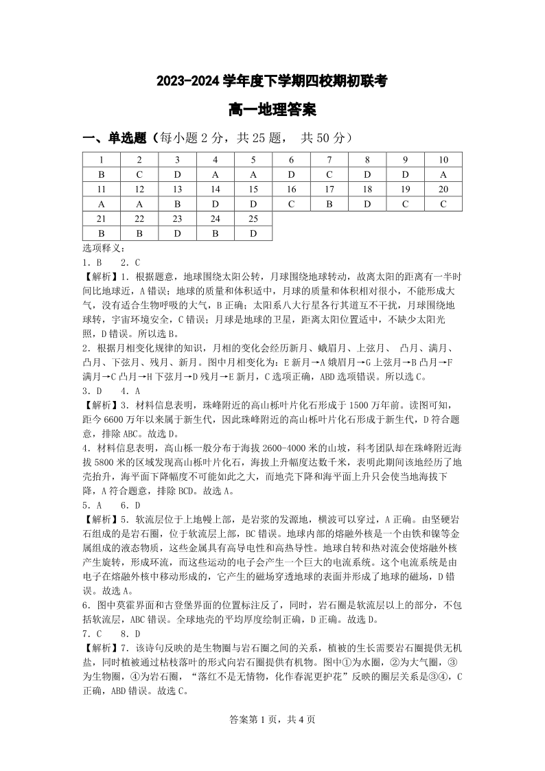 吉林省四校2023-2024学年高一下学期开学联考地理答案