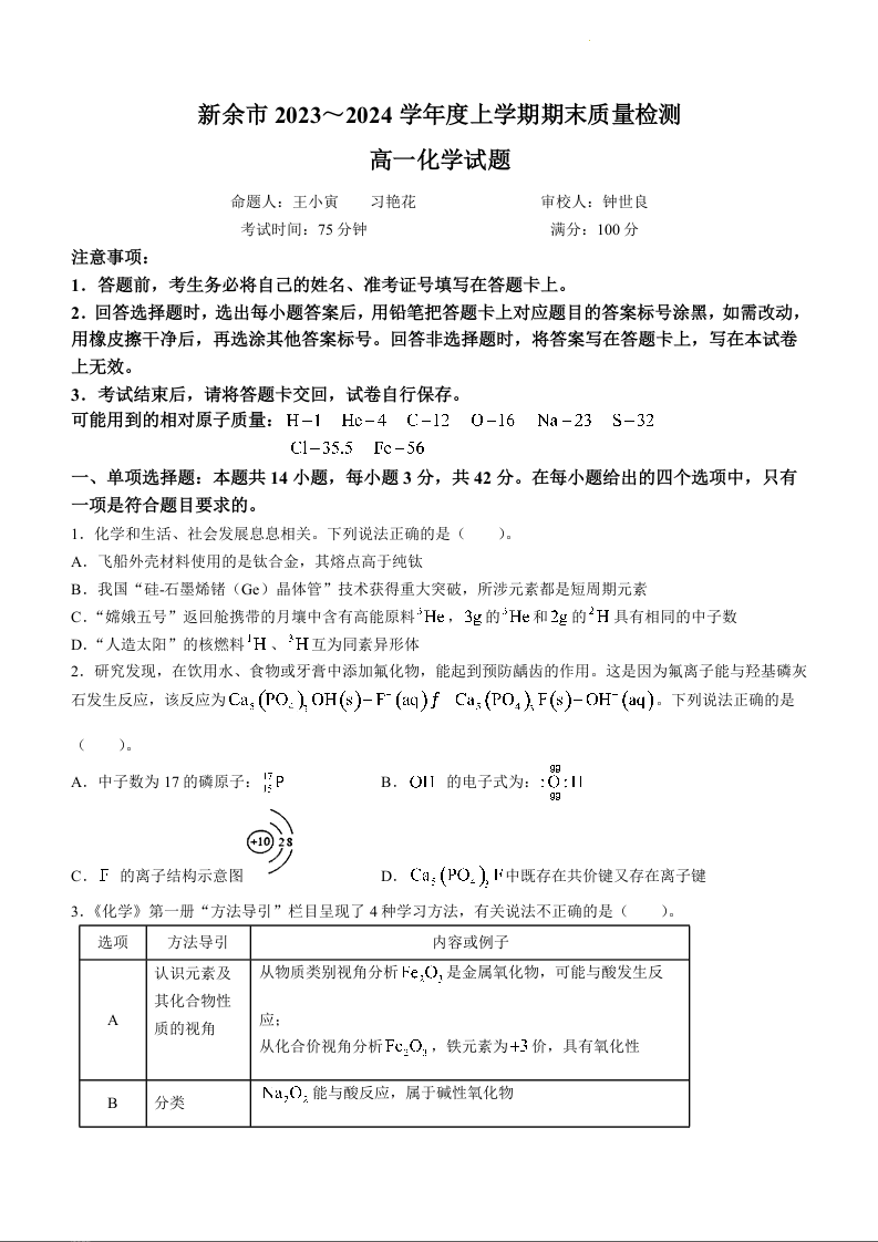 江西省新余市2023-2024学年高一上学期期末质量检测化学+答案