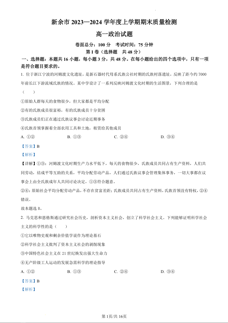 江西省新余市2023-2024学年高一上学期期末质量检测政治(精品解析版)