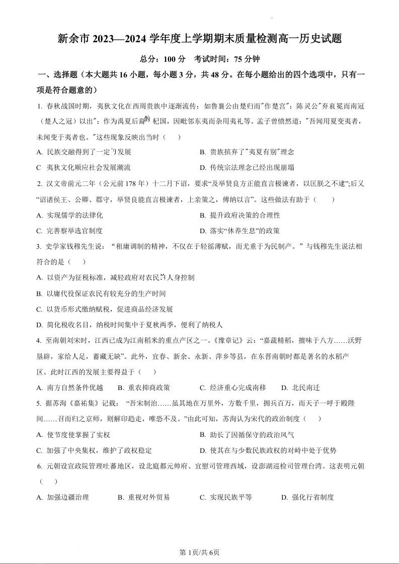 江西省新余市2023-2024学年高一上学期期末质量检测历史(原卷版)