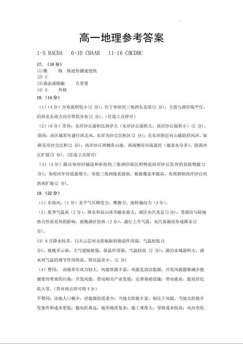 江西省新余市2023-2024学年高一上学期期末质量检测地理答案