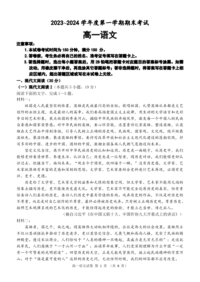 辽宁省锦州市2023-2024学年高一上学期期末考试语文