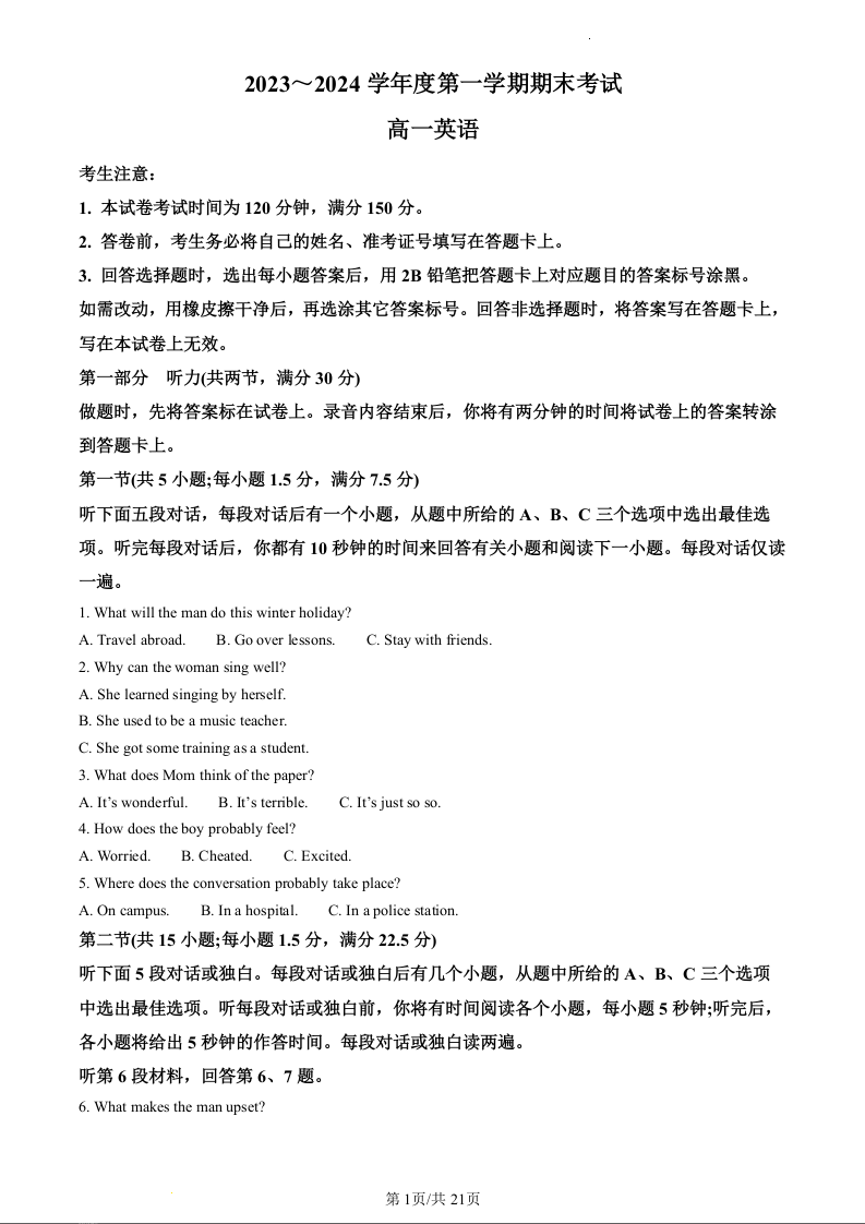 辽宁省锦州市2023-2024学年高一上学期期末考试英语(精品解析版)