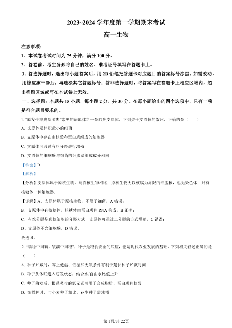 辽宁省锦州市2023-2024学年高一上学期期末考试生物(精品解析版)