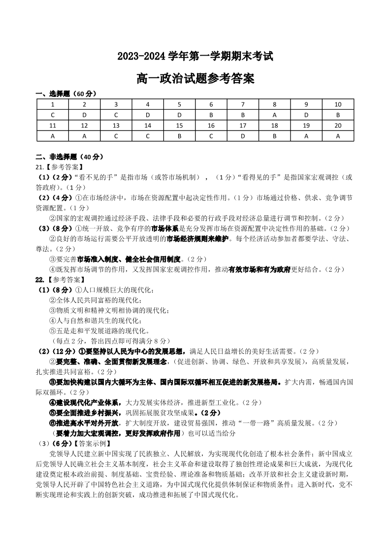 辽宁省锦州市2023-2024学年高一上学期期末考试政治答案