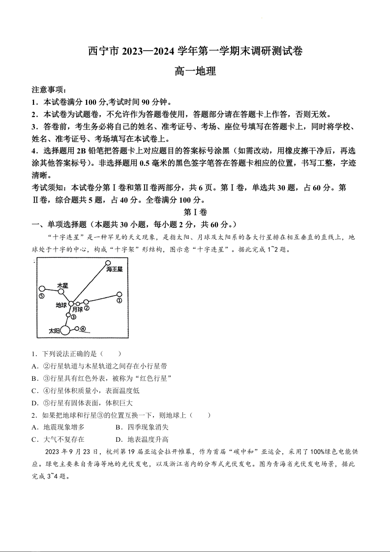 青海省西宁市2023-2024学年高一上学期1月期末考试地理+答案