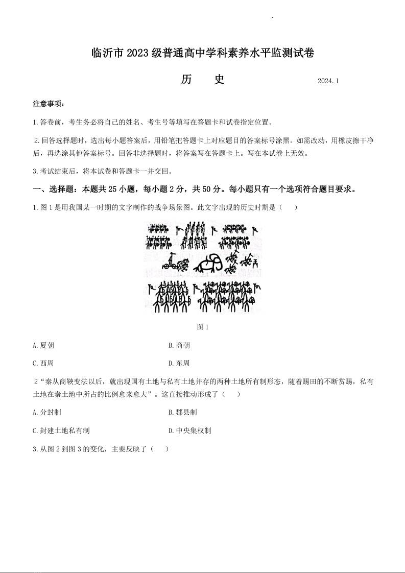 山东省临沂市2023-2024学年高一上学期1月期末考试历史+答案