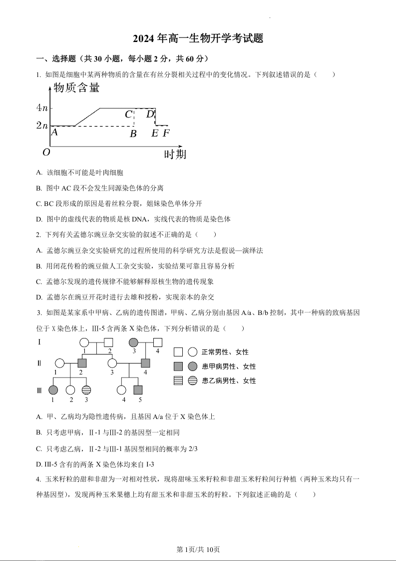 山东省青岛市莱西市第一中学2023-2024学年高一下学期开学考试生物(原卷版)