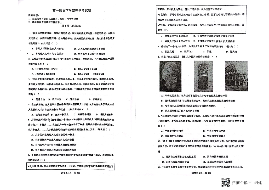 山东省青岛市莱西市第一中学2023-2024学年高一下学期开学考试历史+答案