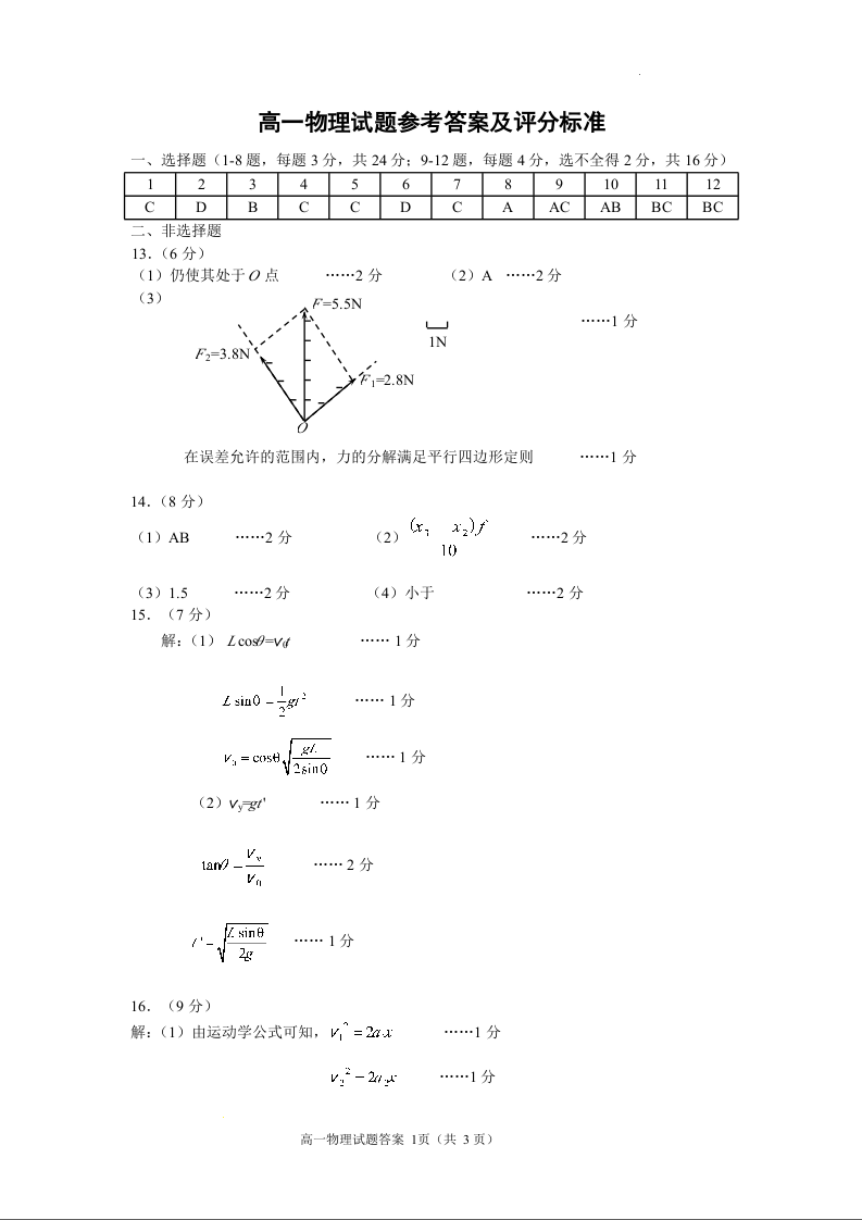 山东省威海市2023-2024学年高一上学期期末考试物理答案