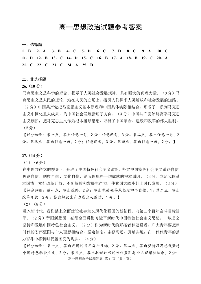 山东省威海市2023-2024学年高一上学期期末考试政治答案