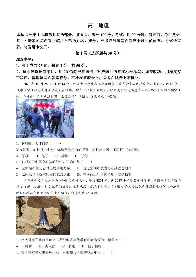山东省威海市2023-2024学年高一上学期期末考试地理+答案