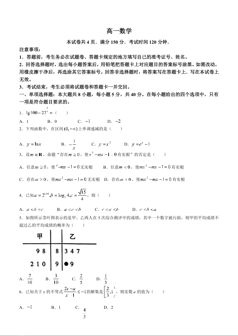 山东省潍坊市2023-2024学年高一上学期1月期末考试数学+答案