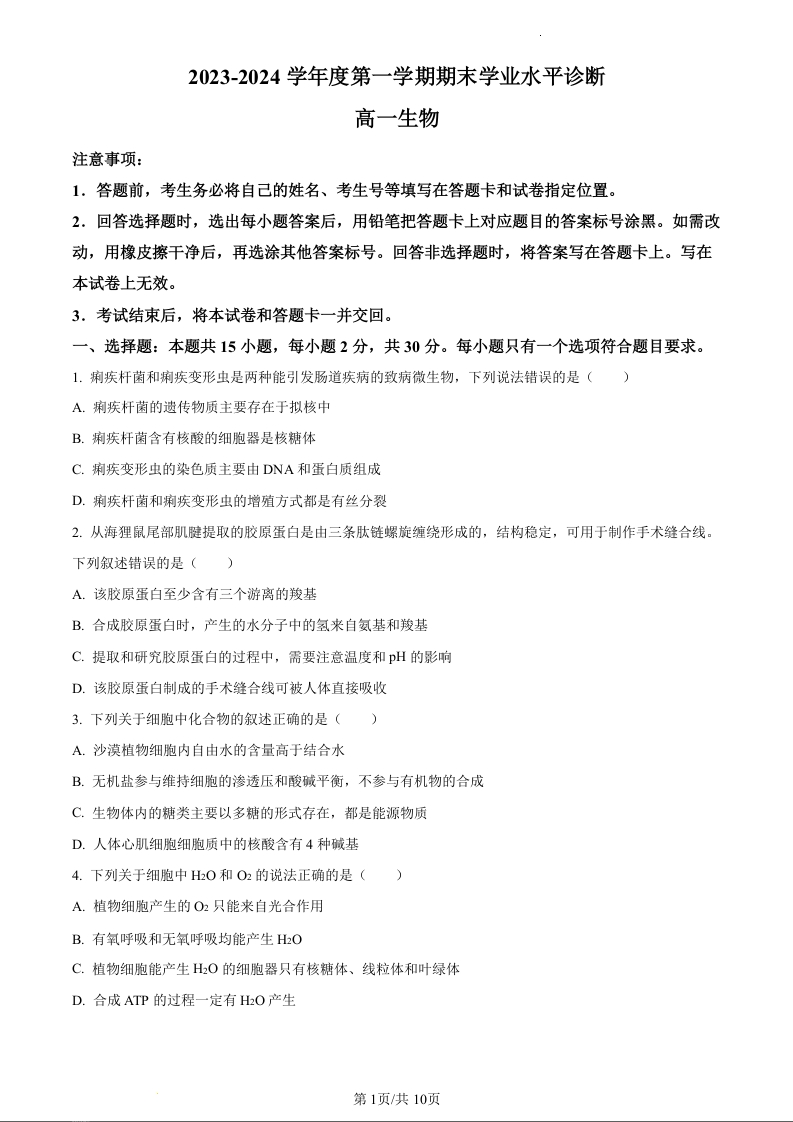 山东省烟台市2023-2024学年高一上学期1月期末测试生物(原卷版)