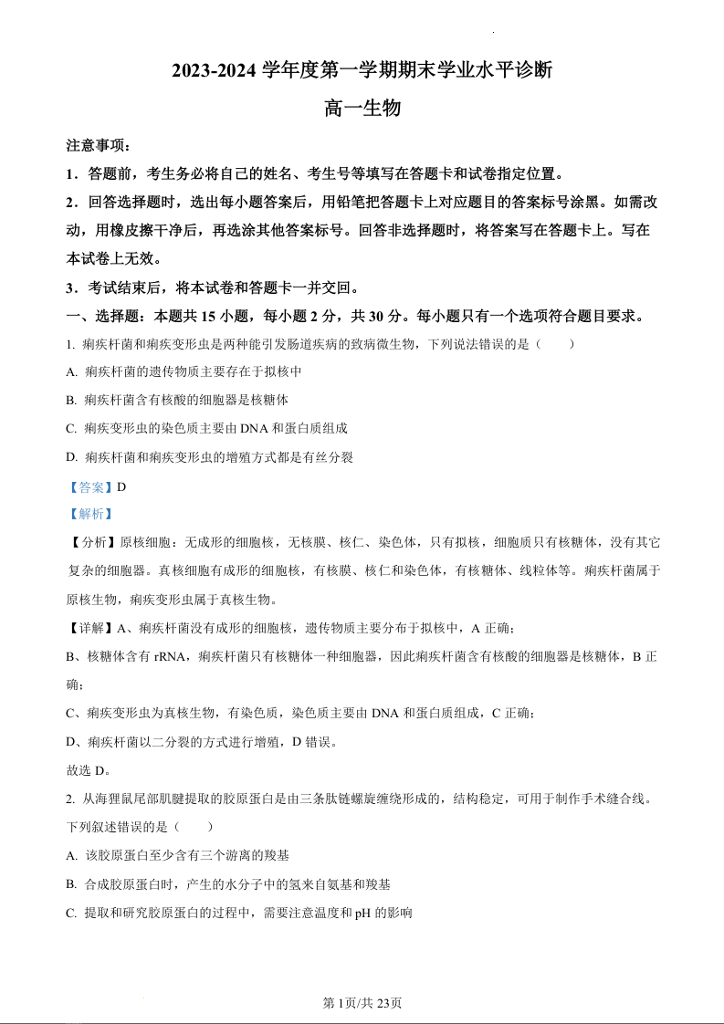 山东省烟台市2023-2024学年高一上学期1月期末测试生物(精品解析版)